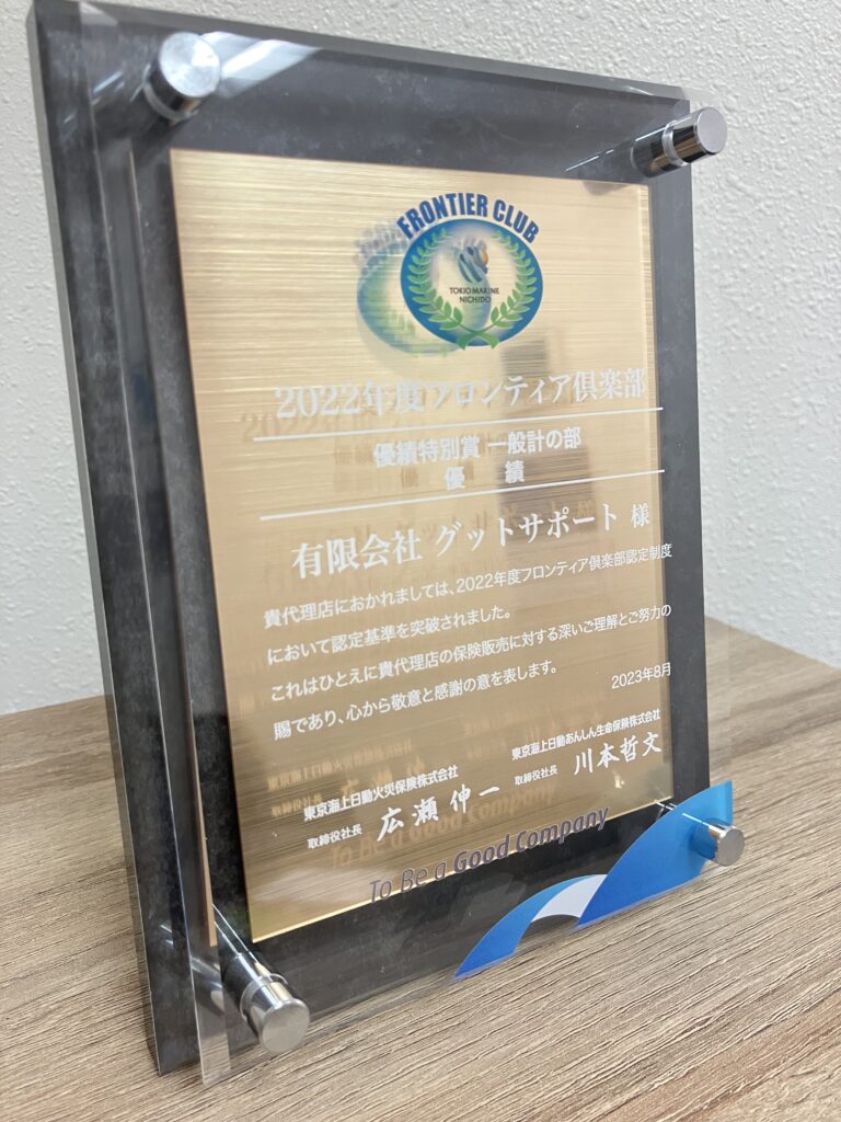 東京海上日動火災様より、2022年度フロンティアクラブ優績特別賞の表彰を受けました。 今後ともスタッフ一同力を合わせて連続表彰目指して頑張ります。